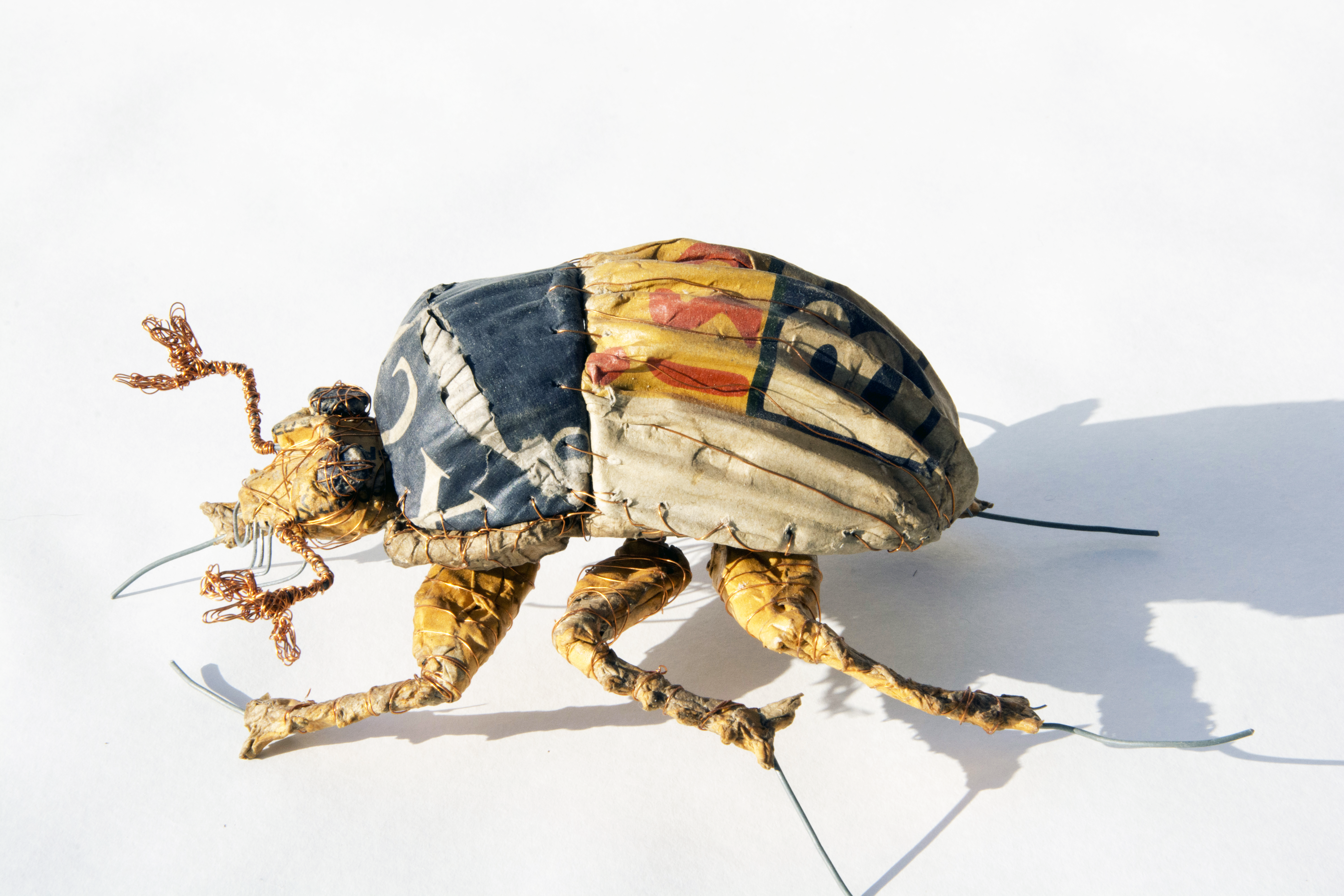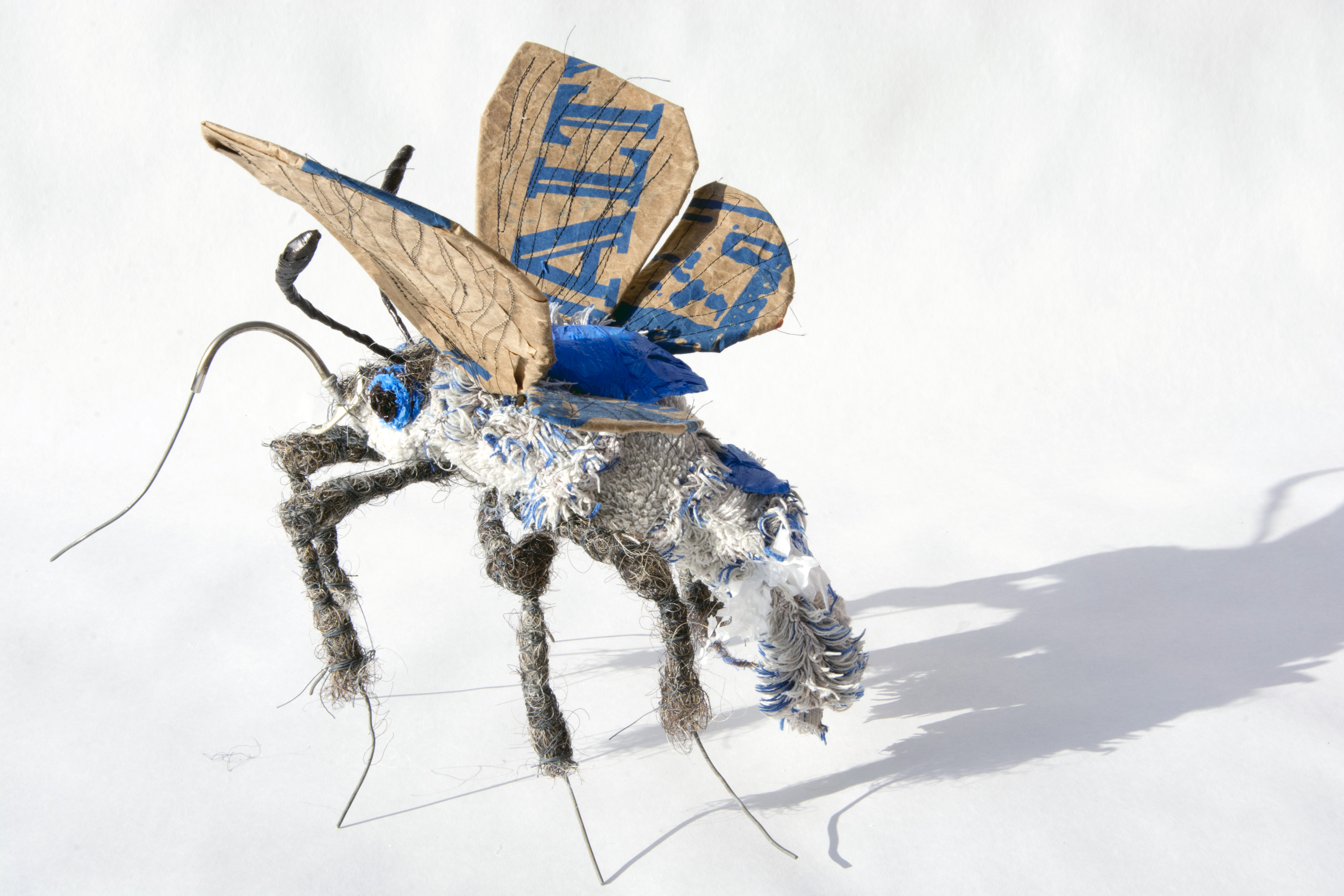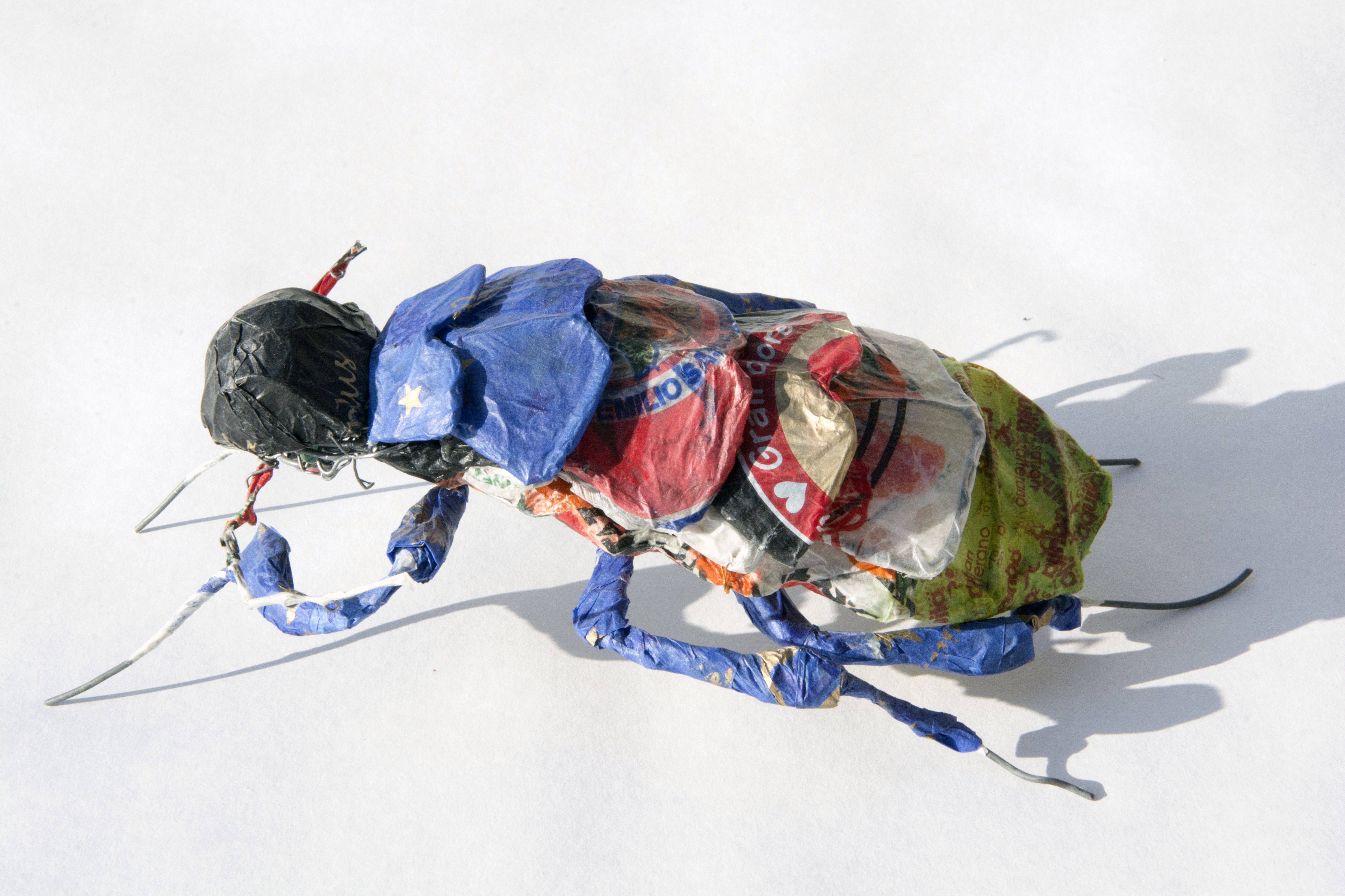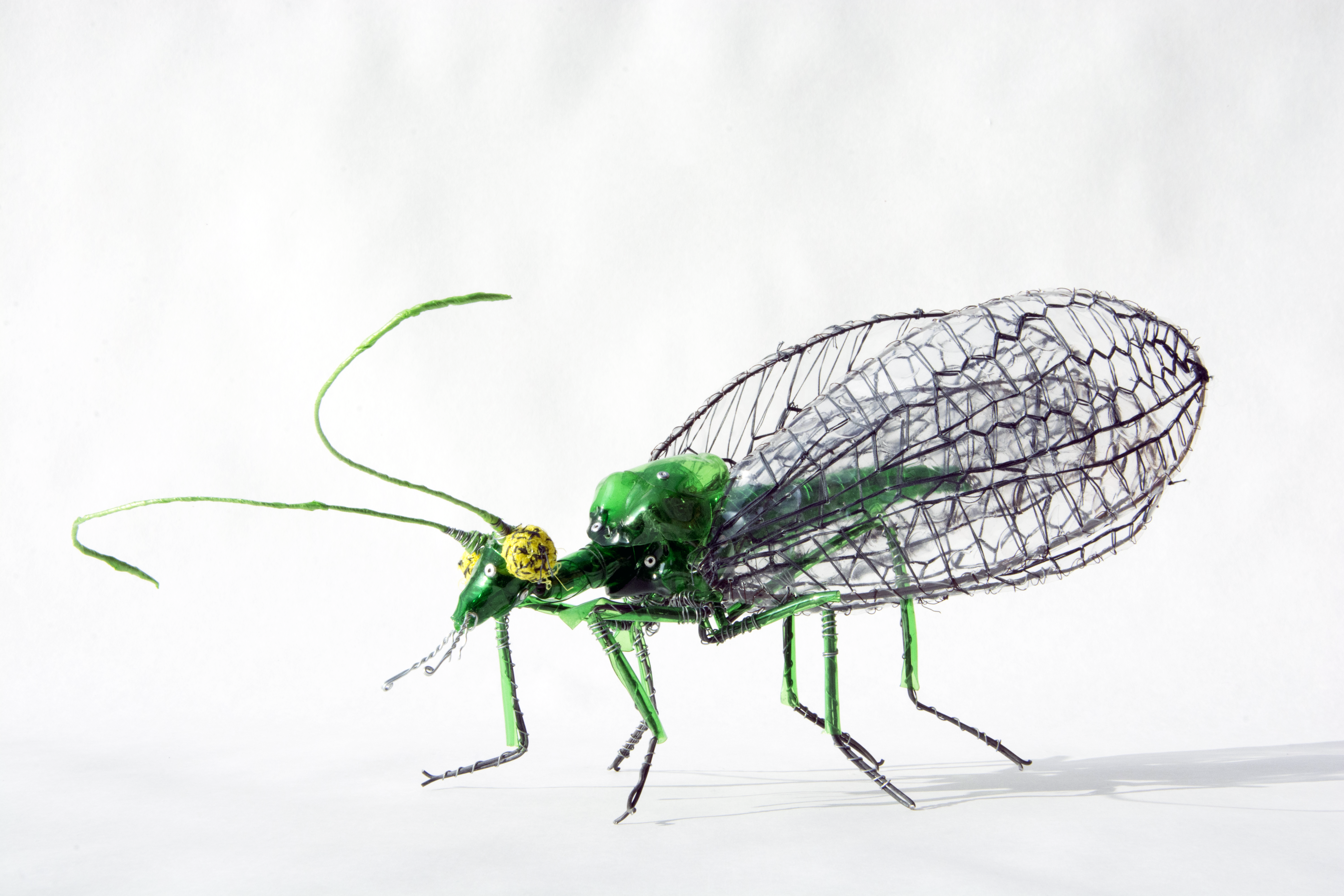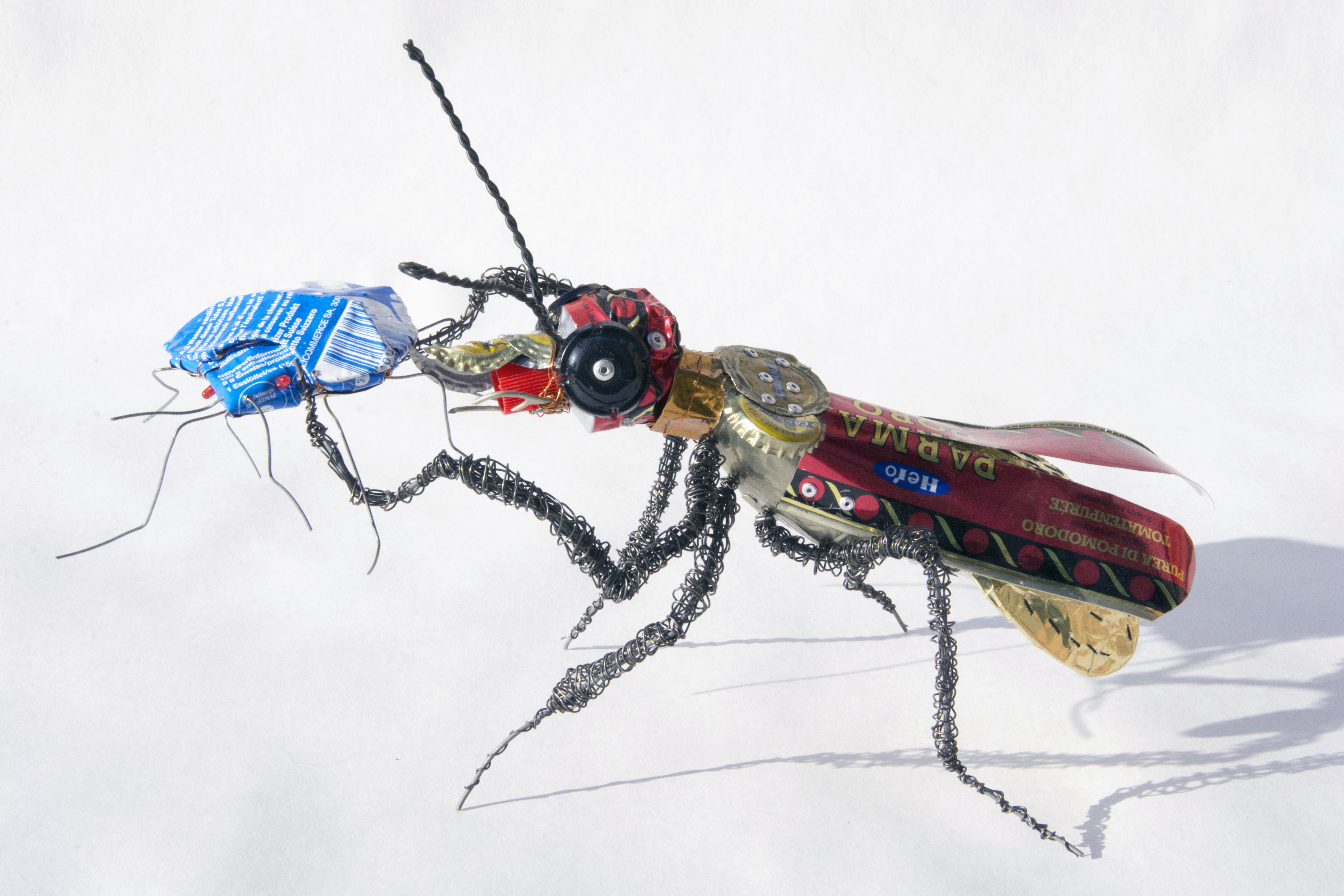 40% des insectes sont menacés d'extinction. 2,5% de la biomasse totale des insectes diminue chaque année à cause de l'Homme. Ces bestioles font partie de notre quotidien, nous les rencontrons partout, sur tous les continents. Mais que connaissons-nous des insectes qui représentent le 70% du monde animal ? Une tentative imaginaire est amorcée par cette série d'insectes en matériaux de récupération qui oeuvrent comme objets témoins de notre société. Syrphe en complet d'escroc, chrysope en exterminateur de jardin, phrygane en sdf des rivières, bousier en bouffe-caca, nécrophore afficinados de viande morte, tous oeuvrent pour la survie et déploient des stratagèmes incroyables, indispensables au cycle de la vie.