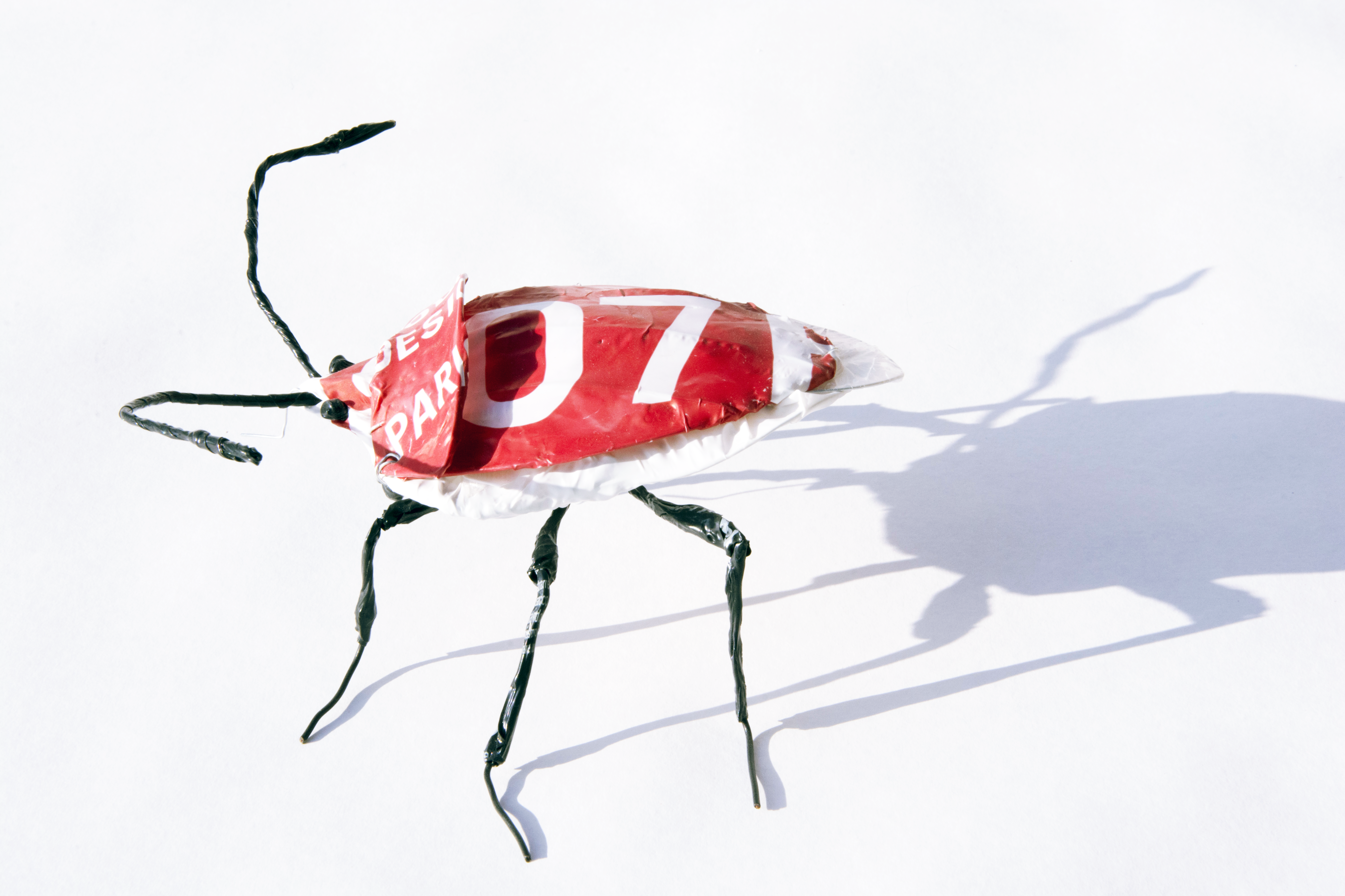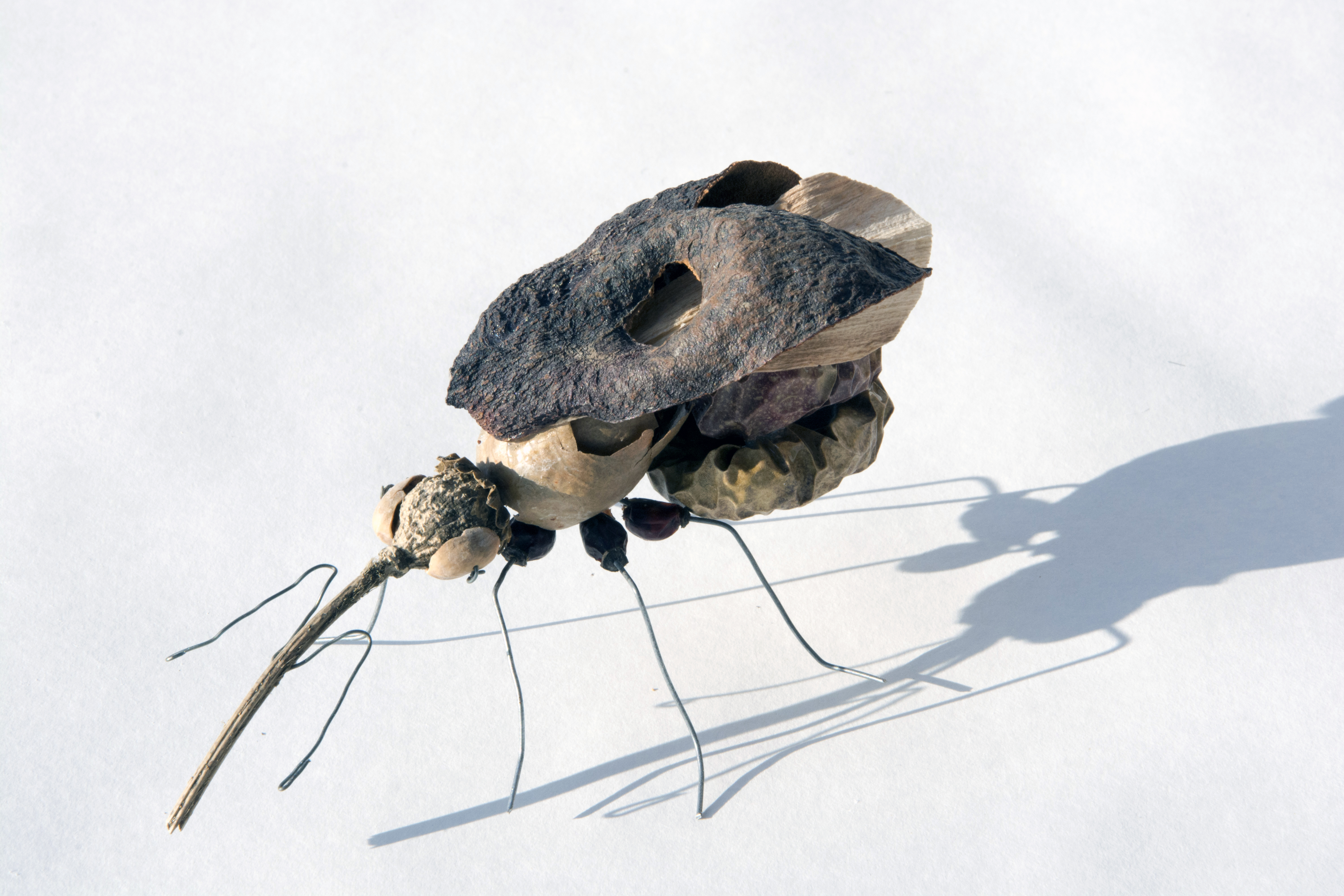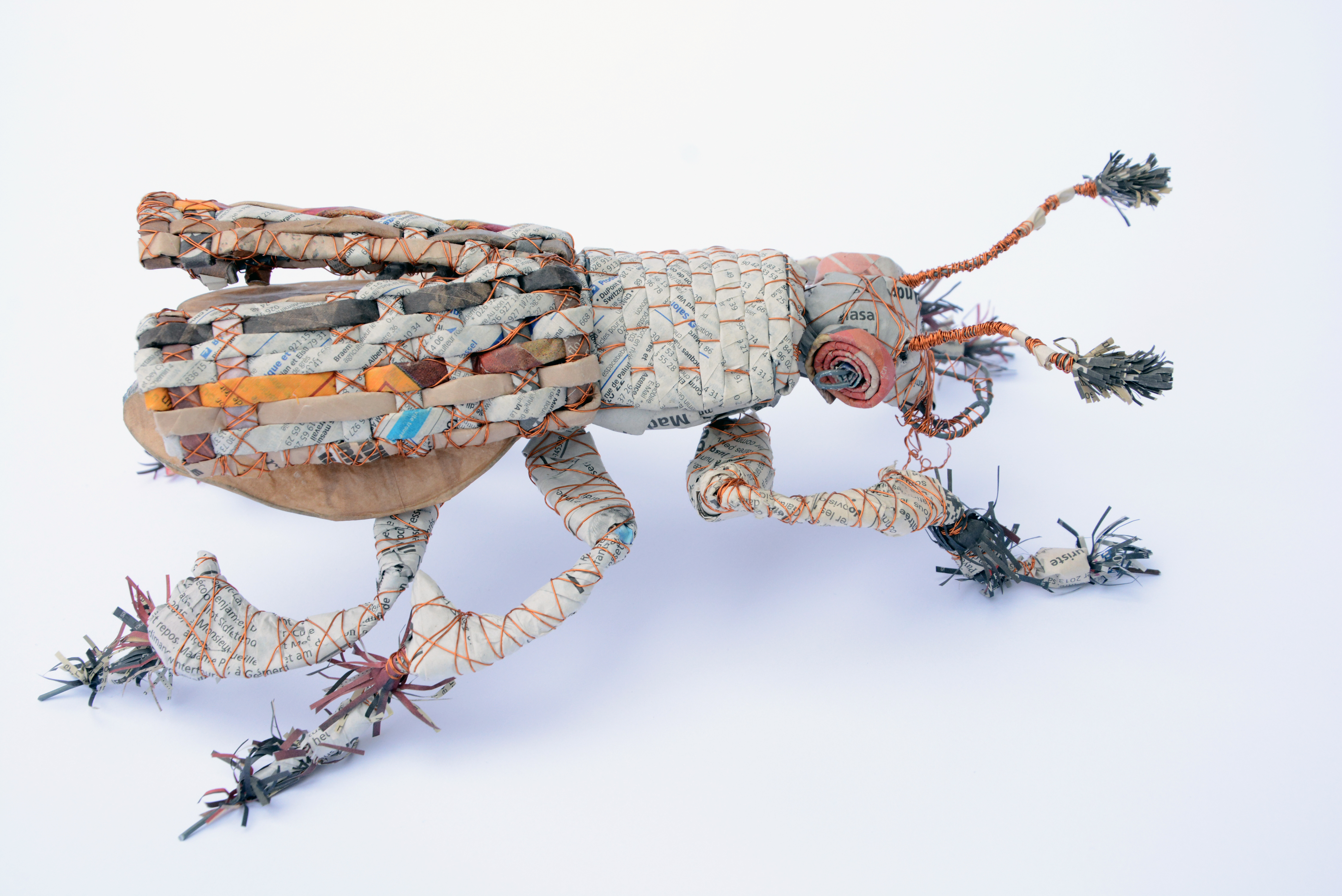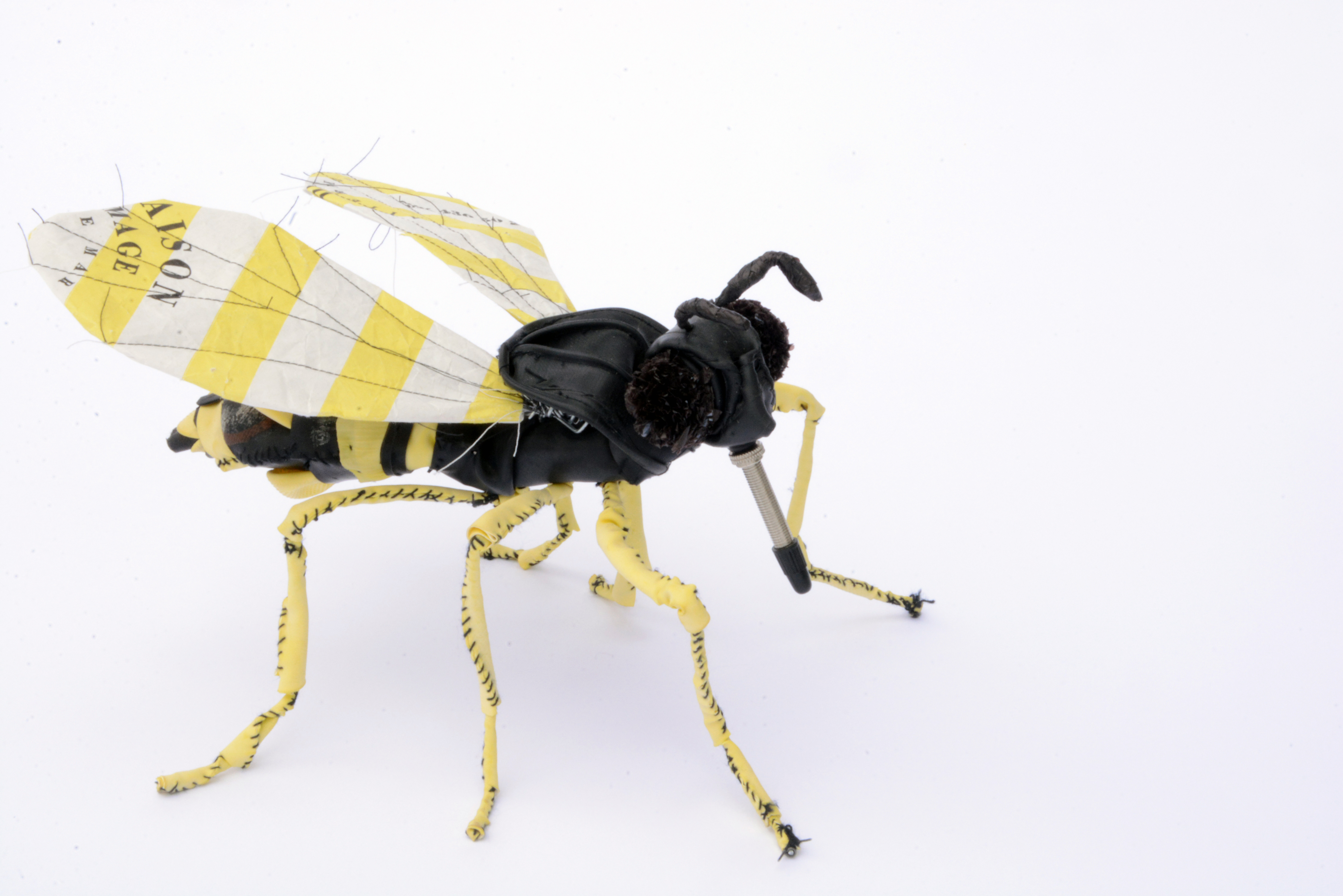 40% des insectes sont menacés d'extinction. 2,5% de la biomasse totale des insectes diminue chaque année à cause de l'Homme. Ces bestioles font partie de notre quotidien, nous les rencontrons partout, sur tous les continents. Mais que connaissons-nous des insectes qui représentent le 70% du monde animal ? Une tentative imaginaire est amorcée par cette série d'insectes en matériaux de récupération qui oeuvrent comme objets témoins de notre société. Syrphe en complet d'escroc, chrysope en exterminateur de jardin, phrygane en sdf des rivières, bousier en bouffe-caca, nécrophore afficinados de viande morte, tous oeuvrent pour la survie et déploient des stratagèmes incroyables, indispensables au cycle de la vie.